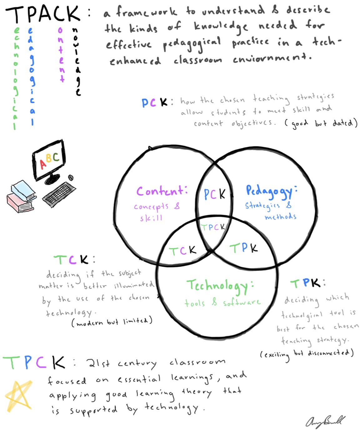 I organized my sketchnote in a strategic manner in order to make it easy to read and understand the TPACK method. I began by color coding the most important terms of the TPACK method, that is technology, pedagogy, and content. I then introduced TPACK and how it is the framework needed for a teacher to correctly integrate technology, effective teaching skills, and overall knowledge of the curriculum to create the most advanced learning environment possible. I subsequently created a Venn diagram of the three main components that was inspired by another one that I found on the Oakland Schools Literacy website. This helped me immensely because it visually depicted how just pedagogical content knowledge, or just technological content knowledge isn’t enough, and how the incorporation of all three is crucial for the 21st century classroom.